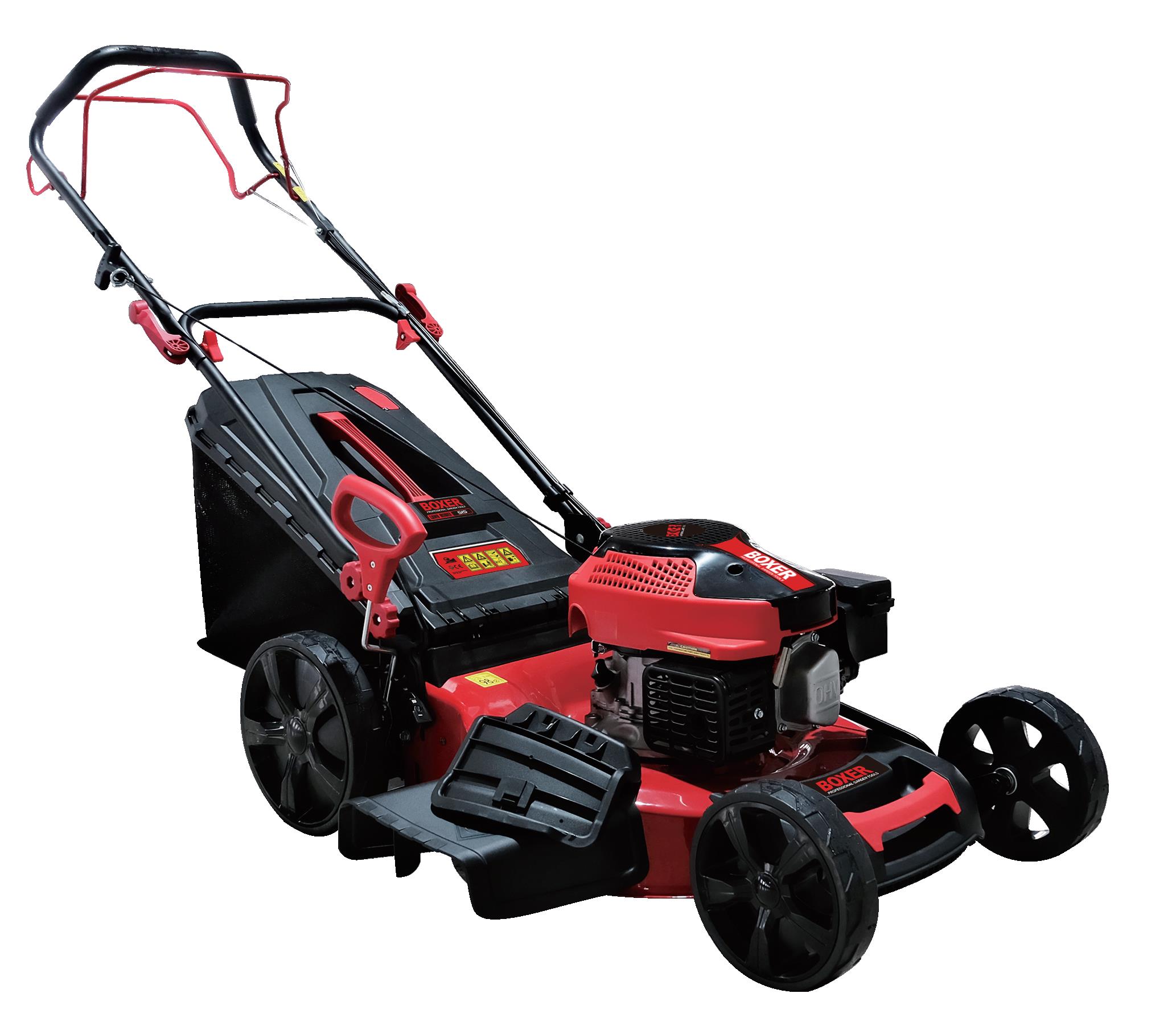 Heavy-duty lawn mower with rear grass collection bag, side discharge chute, and adjustable cutting height. Ideal for medium to large lawns.