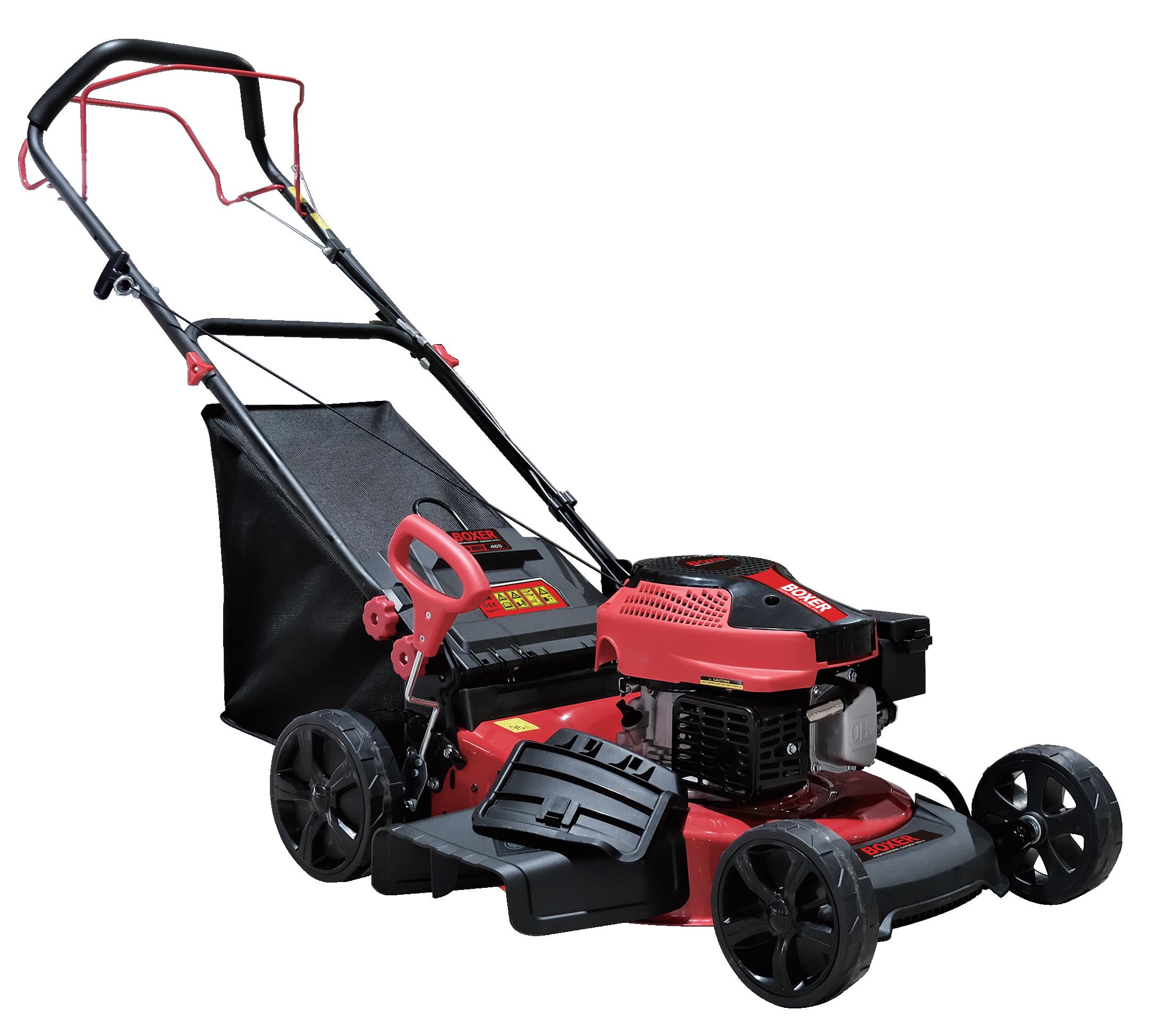Red and black mower with rear grass collection bag